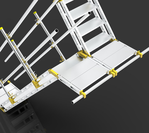 Our approach featured a robust yet lightweight construction using aluminium extrusions for the stair treads and stringers. The treads are secured to the stringers via a rod and circlip system with nylon bushes, ensuring easy assembly. Both the top and bottom landings are removable, enabling flat transport and storage. These landings share the same stringer profiles for support and use custom-designed steel locking hooks with a spring-loaded pin for secure attachment to the Intaks scaffolding system.